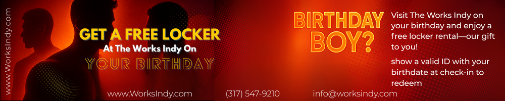 🎉 Celebrate your big day in style at The Works! Birthday Boys get a FREE LOCKER on their birthday — all month logn. Just bring a valid ID and enjoy your special day with us at Indianapolis’s most inclusive men’s sauna and bathhouse.